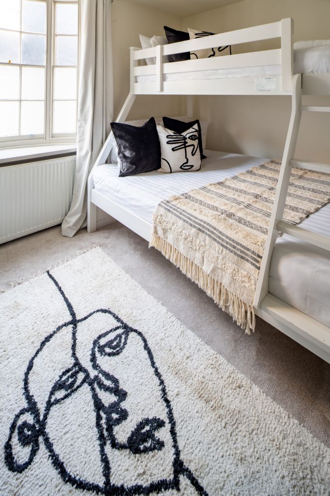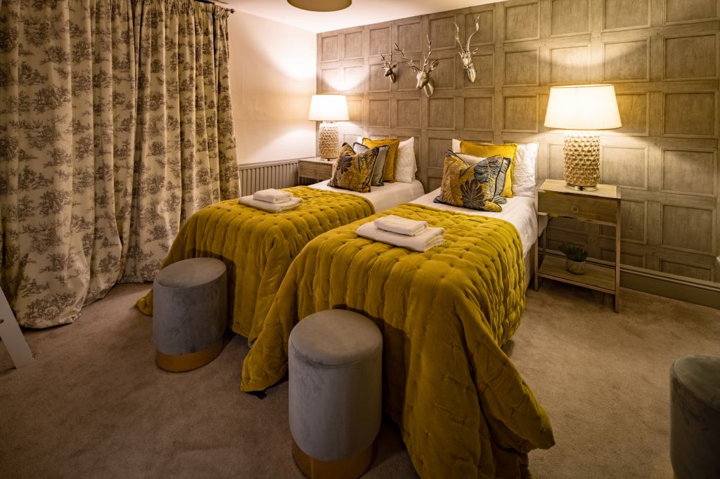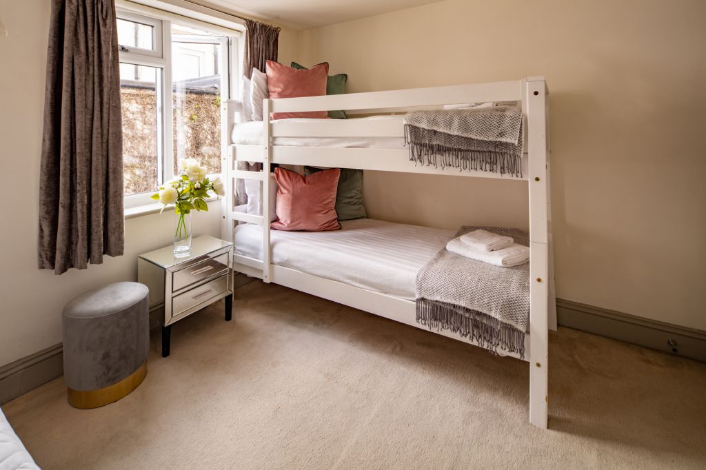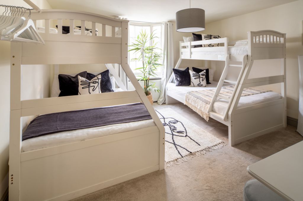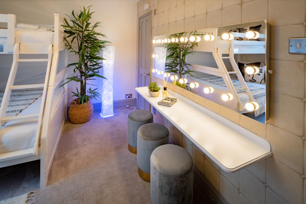On the first floor you’ll find two further bedrooms – each designed to have a distinctive look and feel. Bedroom Two oozes opulence and has 2 sets of bunkbeds – both with doubles on the bottom and singles on top and features a vanity mirror with seating for 3 guests. There’s also a luxurious ensuite bathroom which has a sleek finish and walk-in shower.