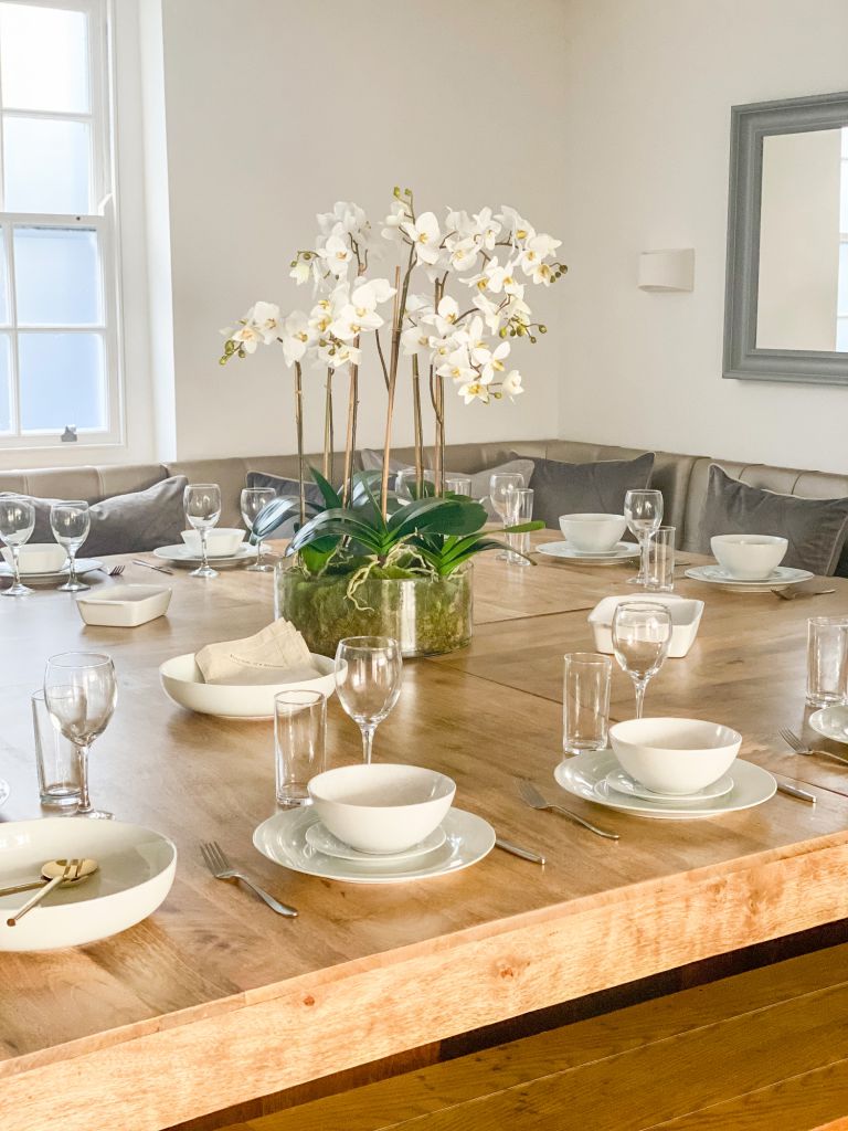 The lower ground floor consists of a large, modern kitchen and dining area with plenty seating for all guests. The kitchen is fully equipped with everything you’ll need during your stay – there’s an oven and 6 burner hob, fridge/freezer, dishwasher, washing machine, TOSHIBA microwave, kettle and toaster. There’s also a wall mounted 42” Smart TV if you want to keep the children entertained.